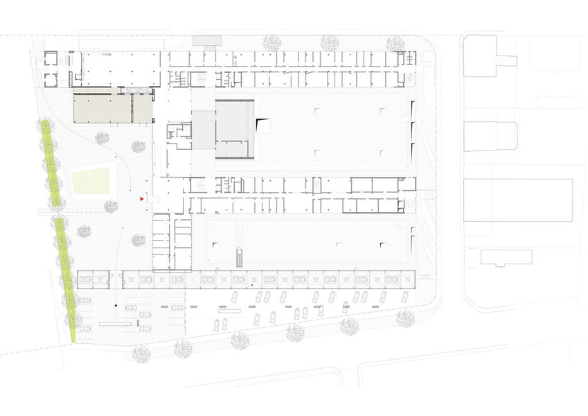 Das bestehende Wasserbecken mit seinem Schilf in der Mitte des Platzes wird als dominierendes Solitär wahrgenommen, das keine weiteren Großformen für Bepflanzungen zulässt.